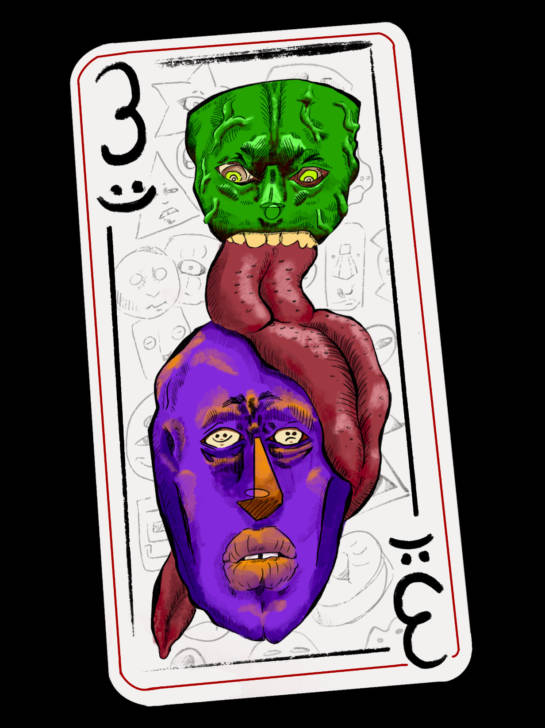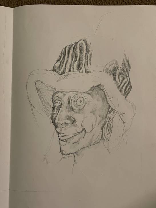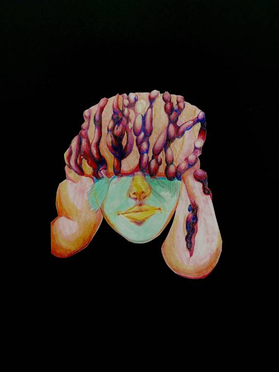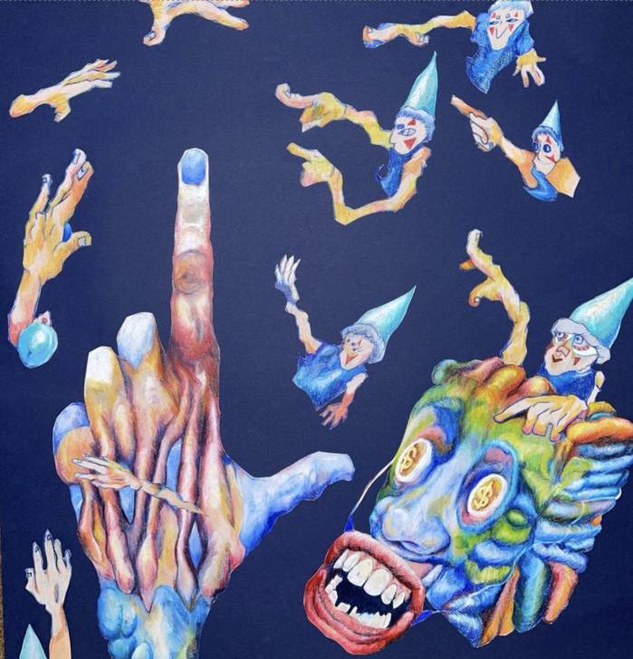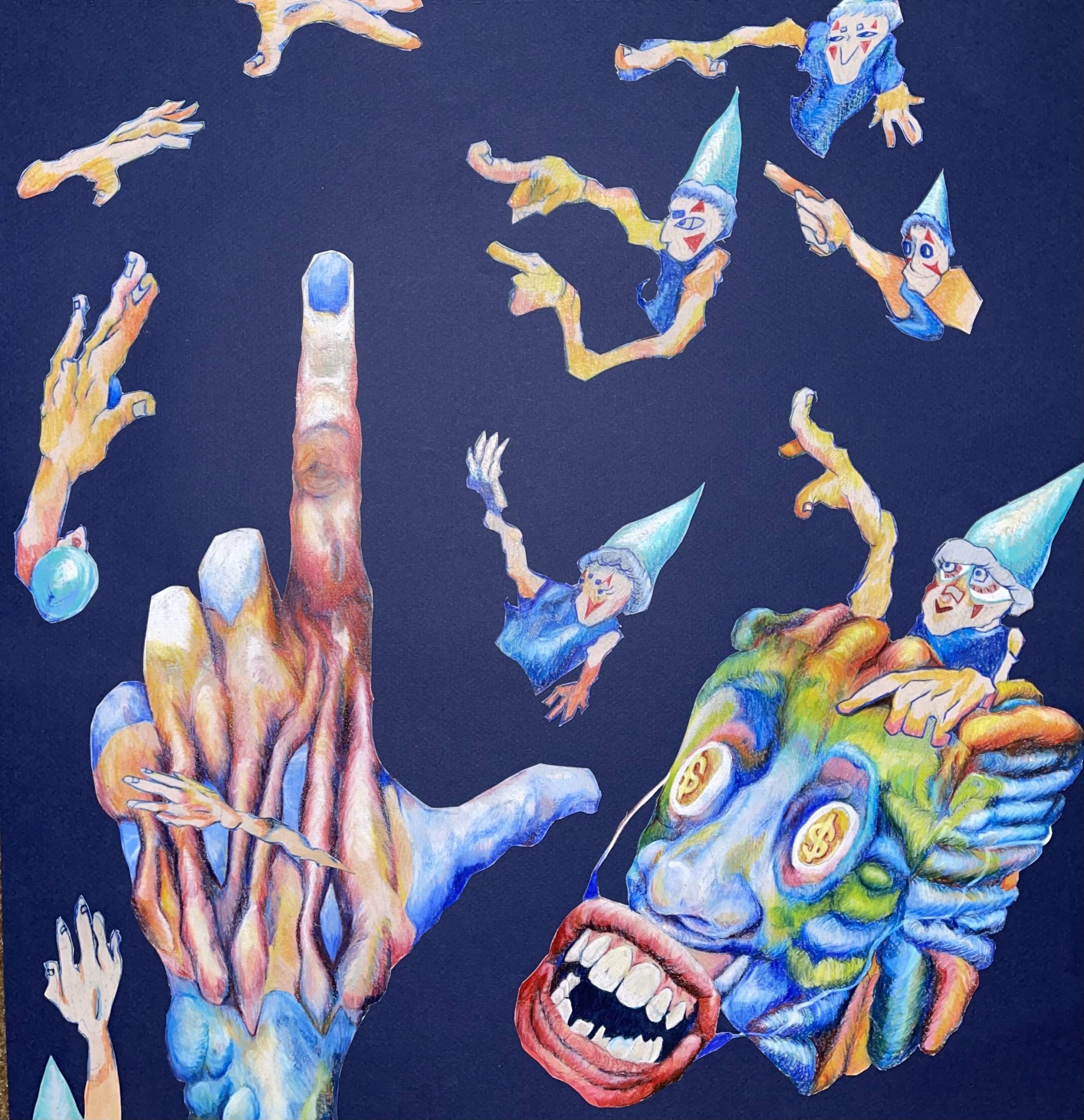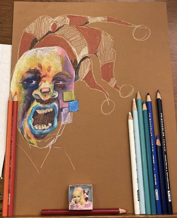 Marley describes his pieces as “collage-ish” and says he uses paint and colored pencils. He also has more recently incorporated pencil and digital art into his works.