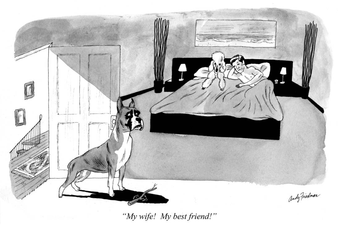 At RISD, where he was enrolled for the next 3-years as a transfer student from Pratt, he began studying the Venetian method of oil painting. Andy’s process was methodical and slow, taking three years to complete a single painting. One of his professors gave him advice, “You either need a lot of wealthy patrons, or you’ll need to get a job.” The professor was Richard Merkin, a celebrated artist and one of the collaged figures on the cover of the Beatles’ Sergeant Pepper’s Lonely Hearts Club Band album. He offered to send some of Andy’s caricatures to The New Yorker, where he was a contributor, and where a former student had become the art director. At the time, Andy didn’t read The New Yorker, and didn’t see contributing to the magazine as his future career. But he drew some samples to give to his professor and then graduated and moved on.