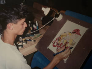 Upon graduating from LIHSA in 1993, Andy experienced two heartbreaks that influenced his next years. One was a sad break-up from a LIHSA crush. Devastated by his rejection from The Cooper Union, who thought his work was too illustrative, Andy headed to Pratt Institute, where he was permitted to skip Freshman year and take a grad school level anatomical drawing class to study the laws of figure drawing established by the old masters – a class he loved. But he dropped out after a semester when he found out that he’d be required to make up the missing freshman credits down the line.