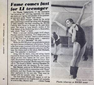 In her senior year at LIHSA, Phoebe auditioned for the cast of MGM/United Artist’s television series Fame, based on the film of the same name, following the lives of students and faculty at the High School for Performing Arts in NYC. The more recent seasons of the show had been focused on featuring more modern music and dance styles. Bill Blinn, the Executive Producer and creator of the original film, wanted to return to its more classical roots by introducing a new character. Phoebe landed the job and was cast as Alicia Morgan, a young opera singer. Phoebe filmed her episodes in LA, accompanied initially by her mom, then by LIHSA’s Pat Michaels.