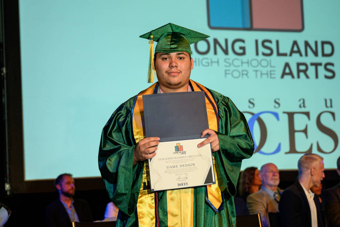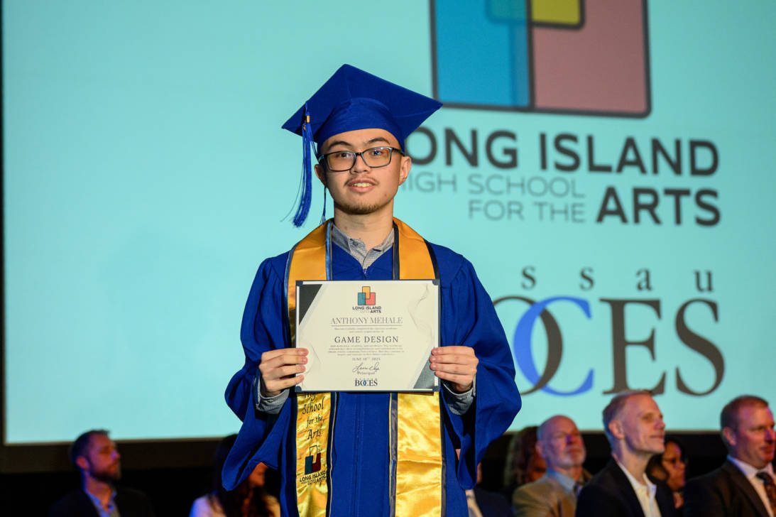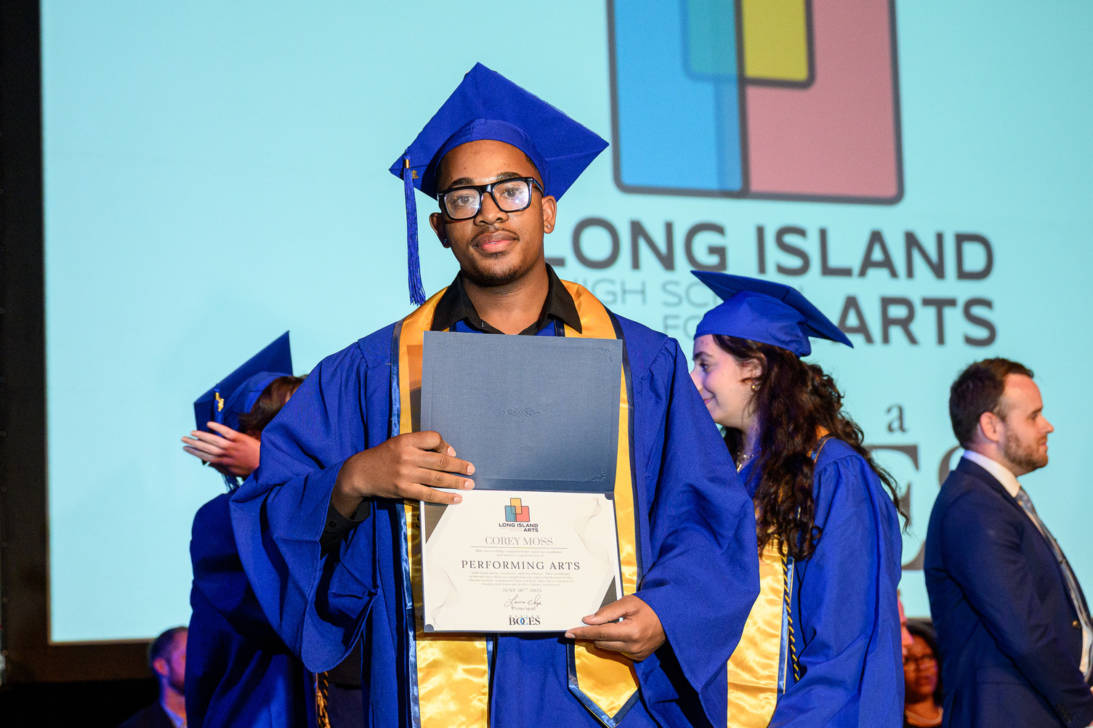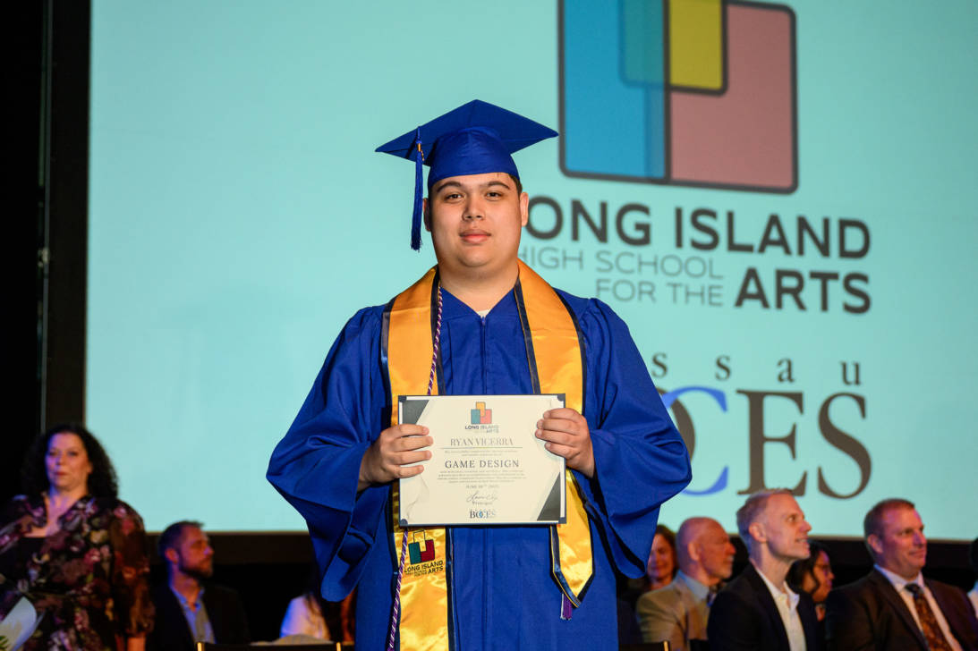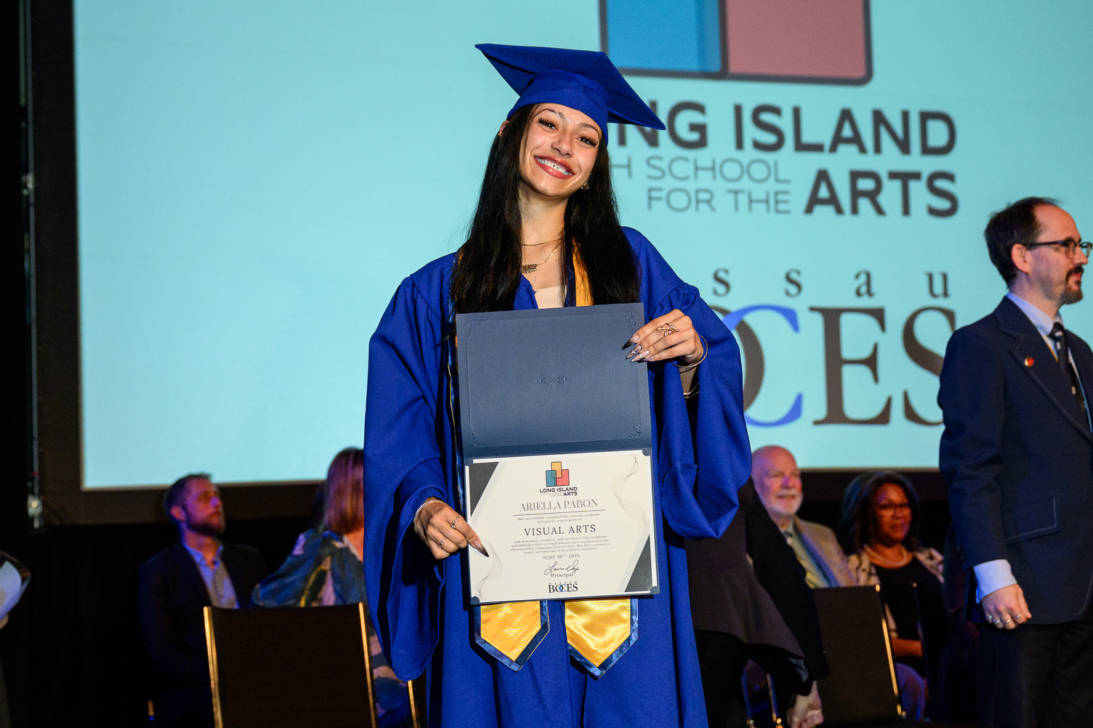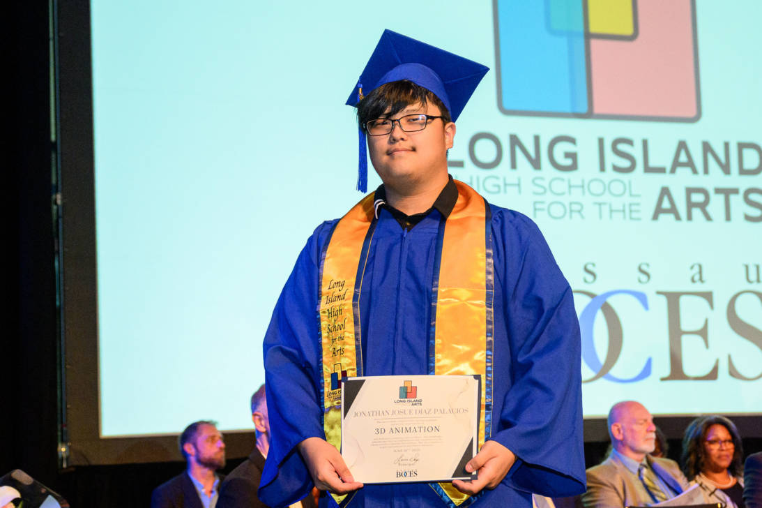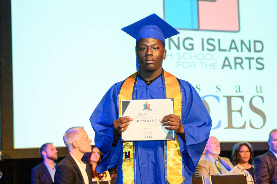 Graduates from diverse programs like 3D Animation, Performing Arts, and Visual Arts walked the stage, each representing a district from across Long Island.