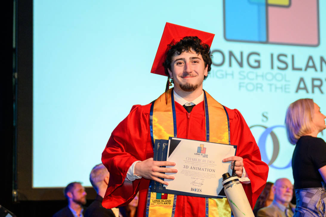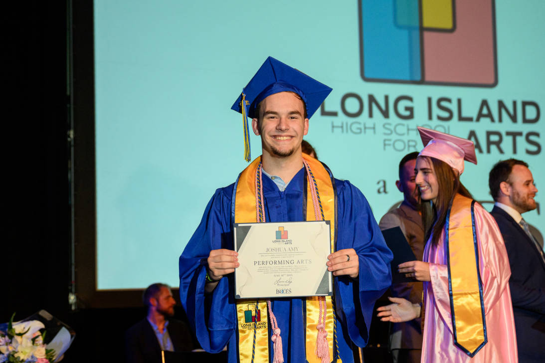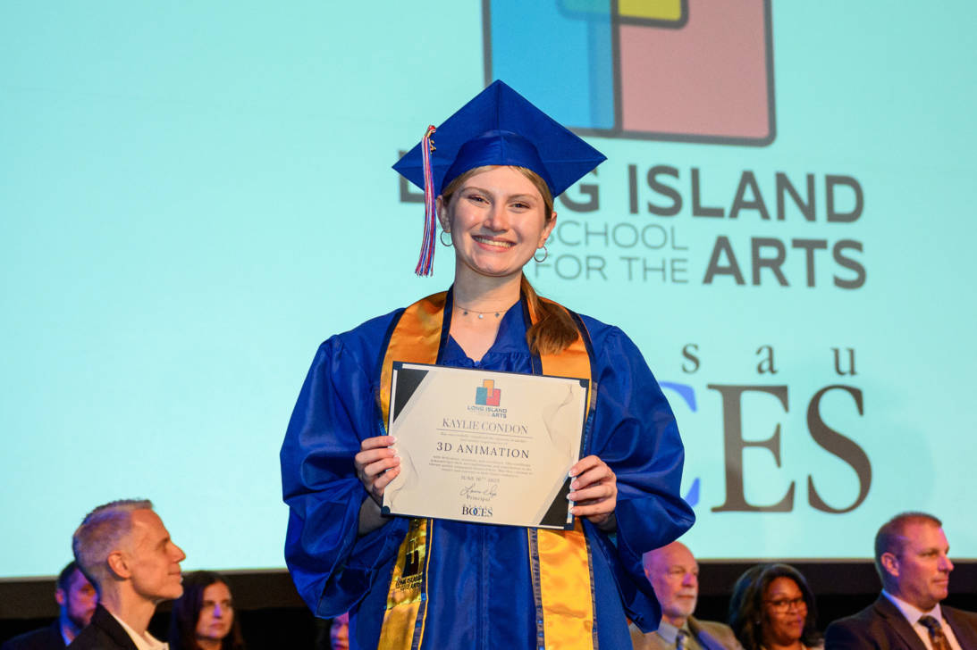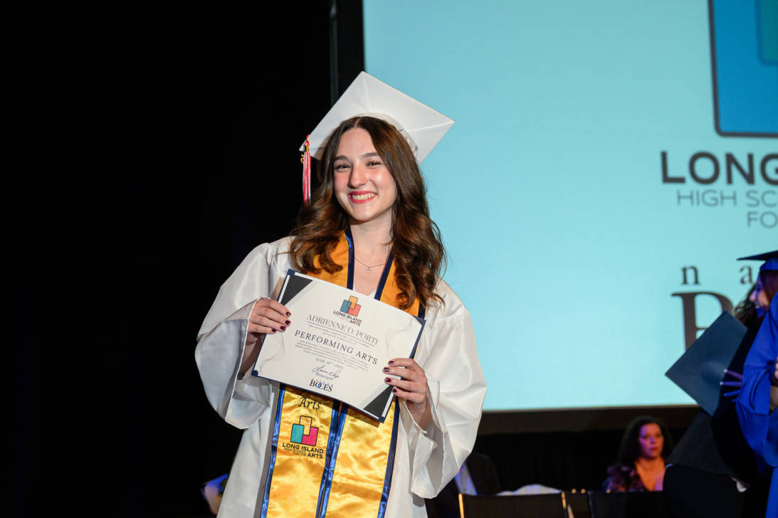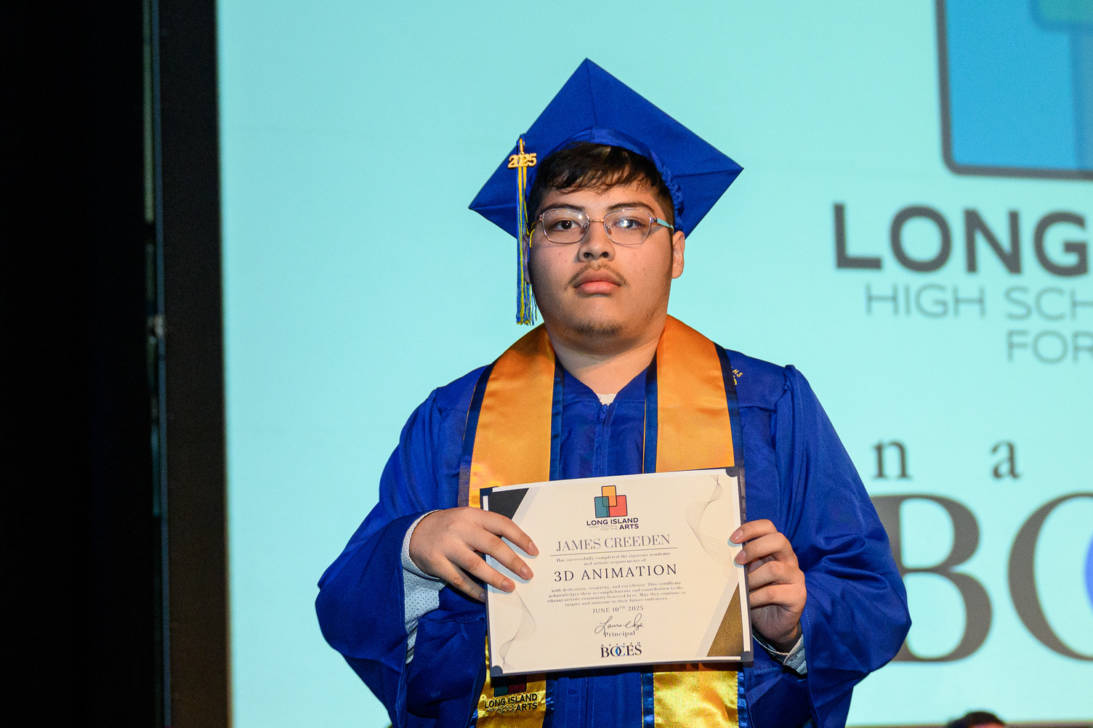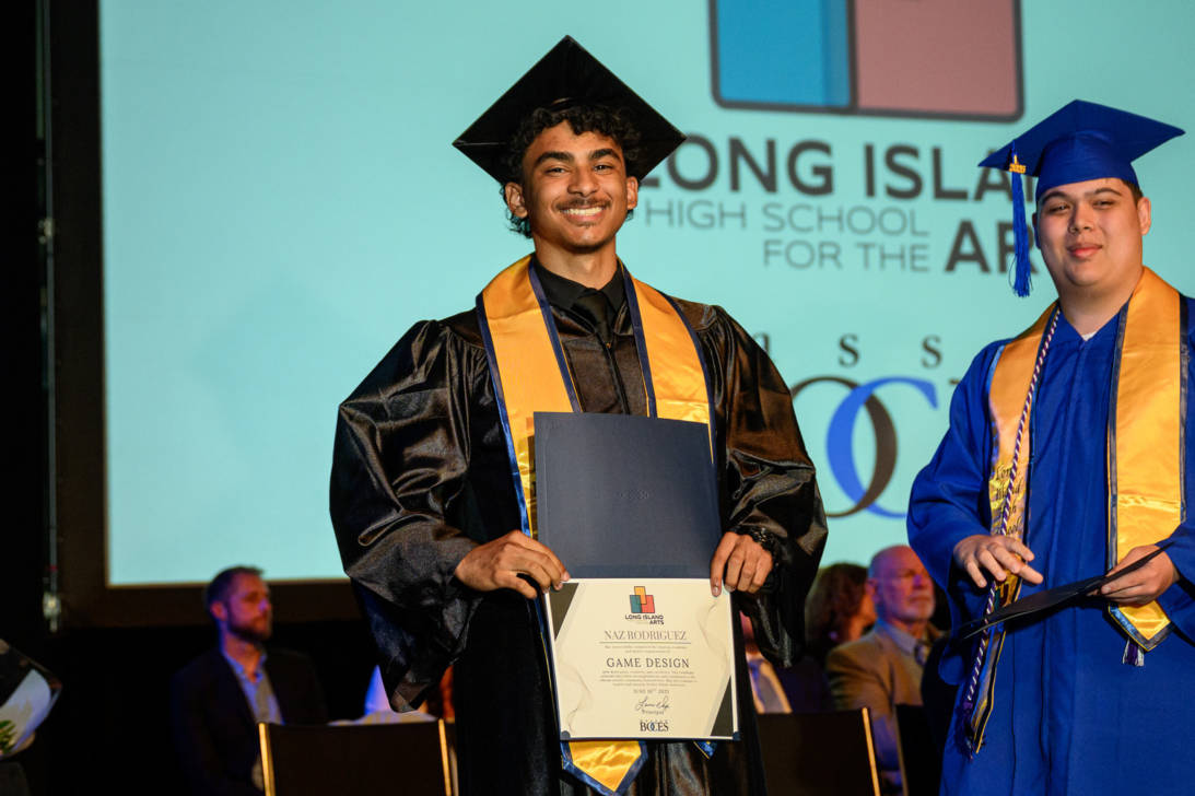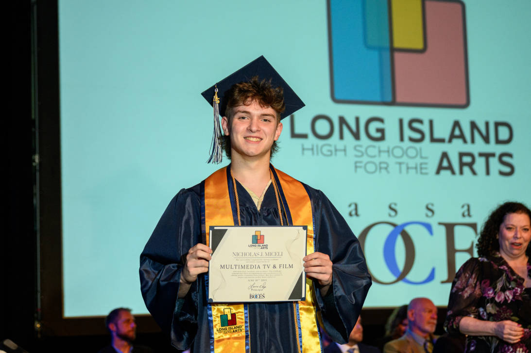 Graduates from diverse programs like 3D Animation, Performing Arts, and Visual Arts walked the stage, each representing a district from across Long Island.