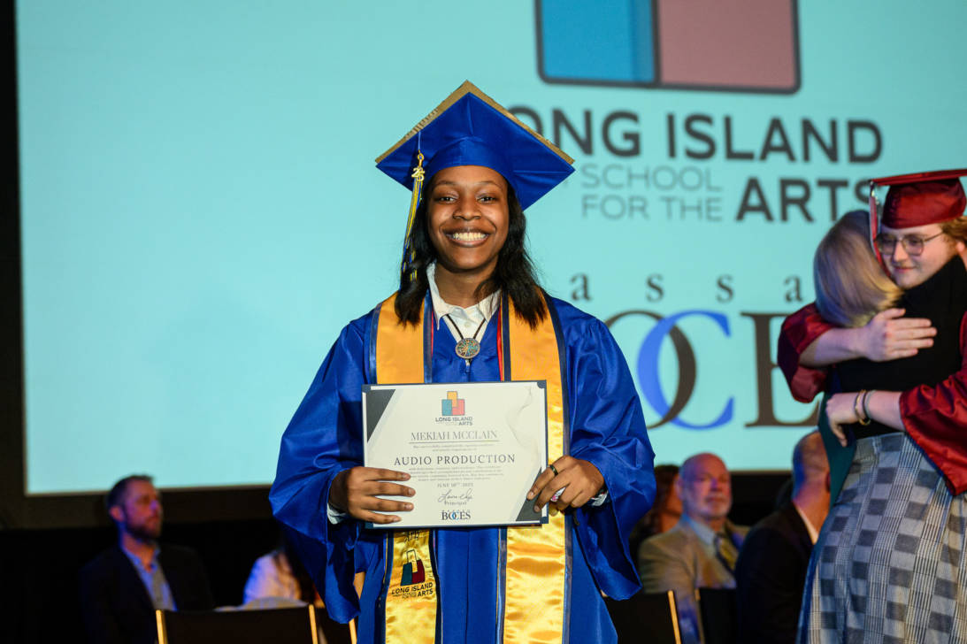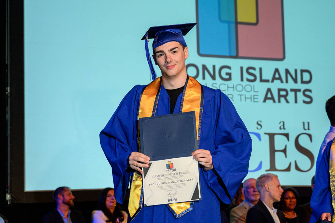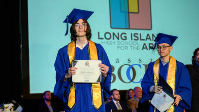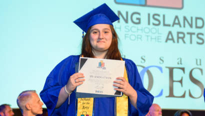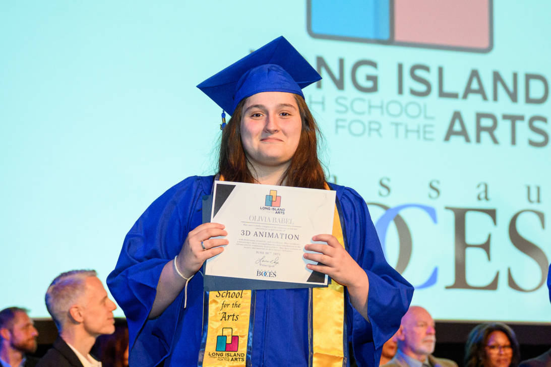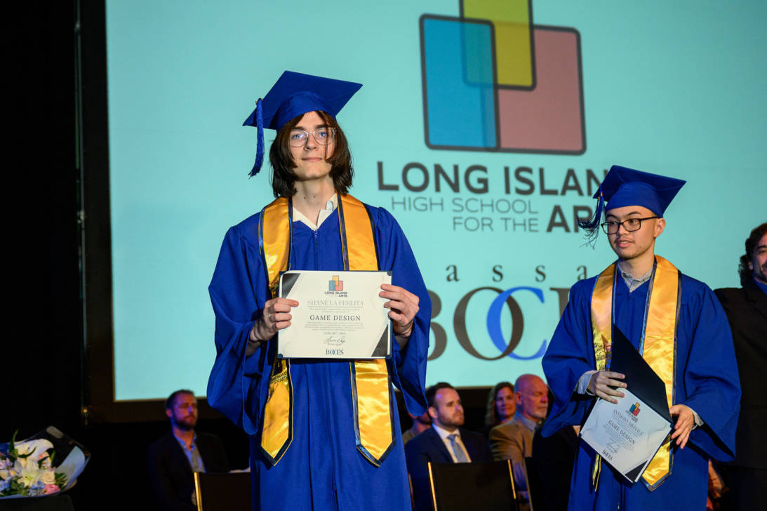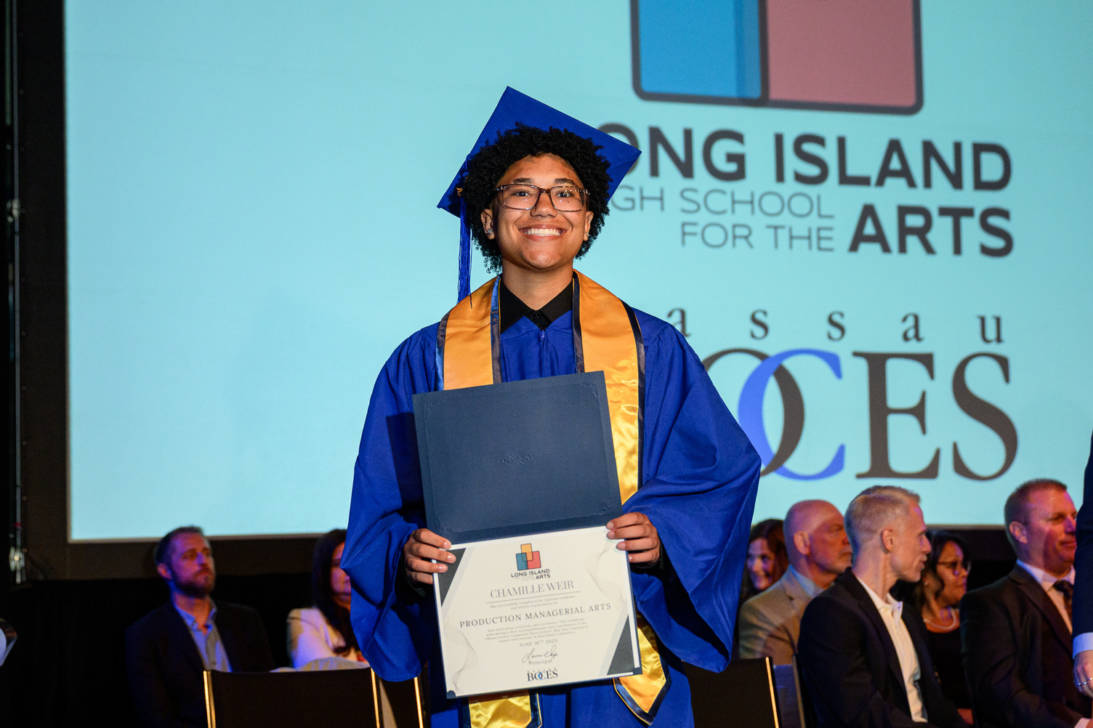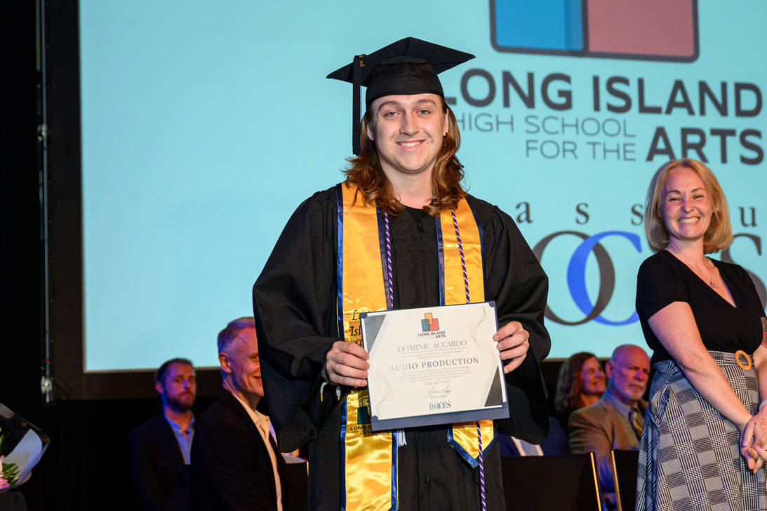 Graduates from diverse programs like 3D Animation, Performing Arts, and Visual Arts walked the stage, each representing a district from across Long Island.