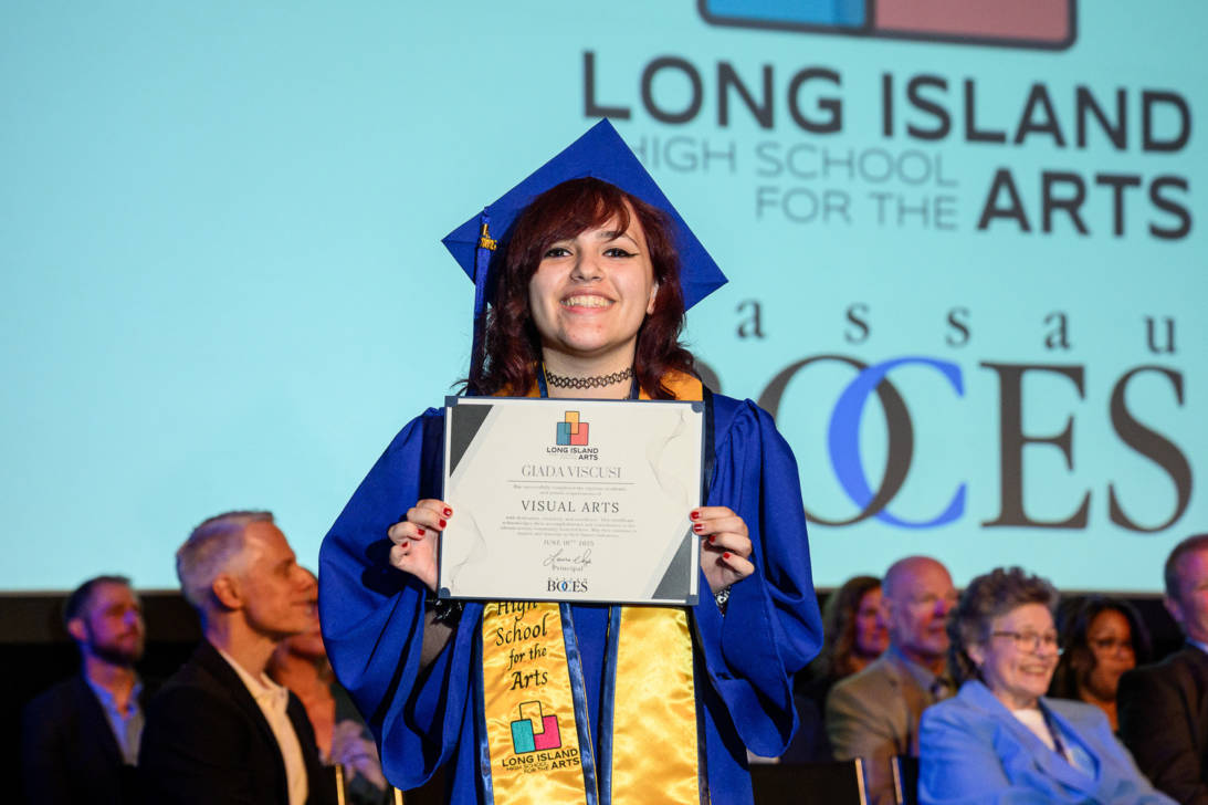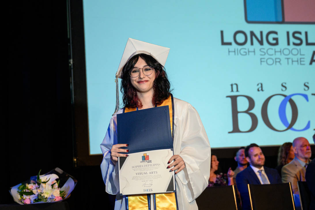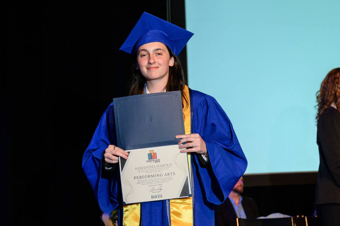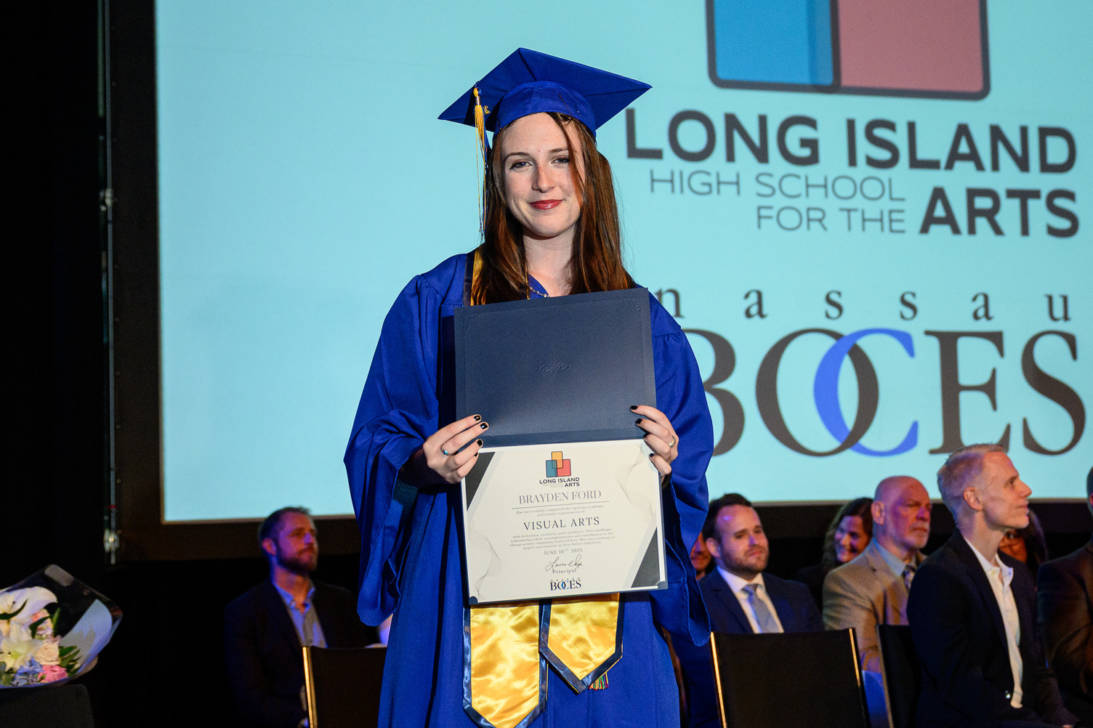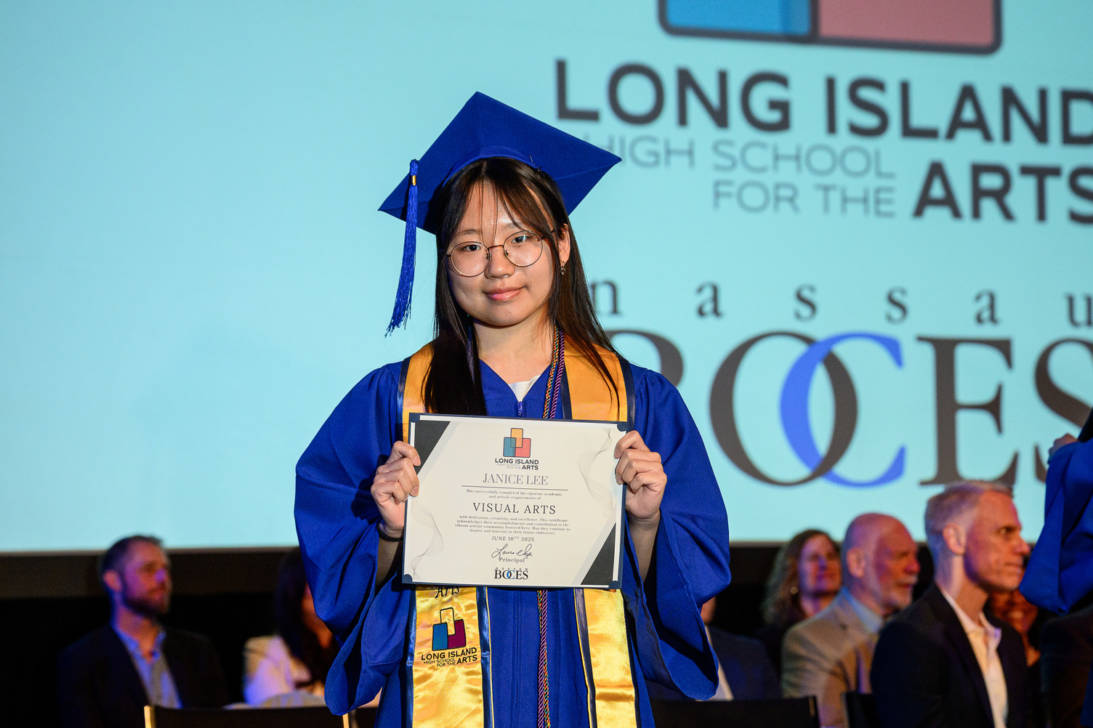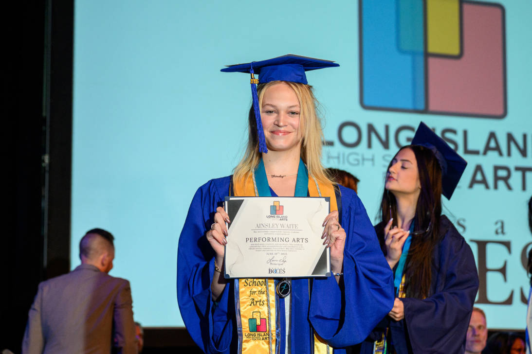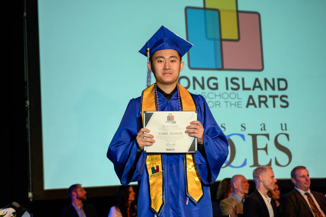 Graduates from diverse programs like 3D Animation, Performing Arts, and Visual Arts walked the stage, each representing a district from across Long Island.