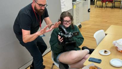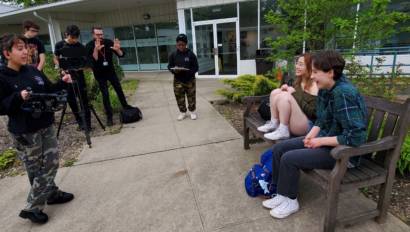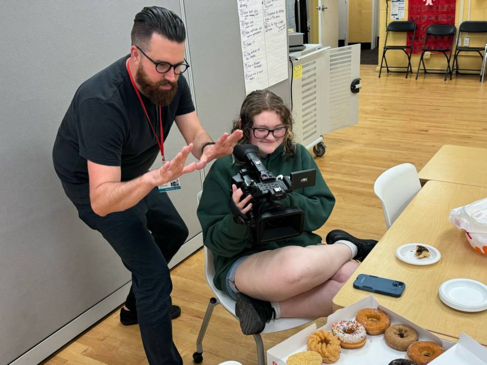 In the spring, Foerschner helped students with a project called a “oner,” which is one continuous shot that flows without cutting and tells the story with the movement of the camera. Students constructed scenes by following characters around a variety of locations at LIHSA. They also worked on a point-of-view project, during which they fixed an inanimate object to the front of the camera, and had it move around the world in a way that shared its journey as the main character.