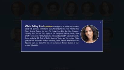 In her junior year at Catholic, she landed her first professional company roles: she was part of the ensemble and understudied Nettie in The Color Purple and played Carla in In the Heights at Toby’s Dinner Theater. Her final year at Catholic she chose not to audition for shows, but instead to focus on working with one of her mentor professors on her creative projects so Olivia could continue to learn on how to choreograph and teach. She is so appreciative of this special experience that set her up to teach later in her career. She has remained close with her mentor.
